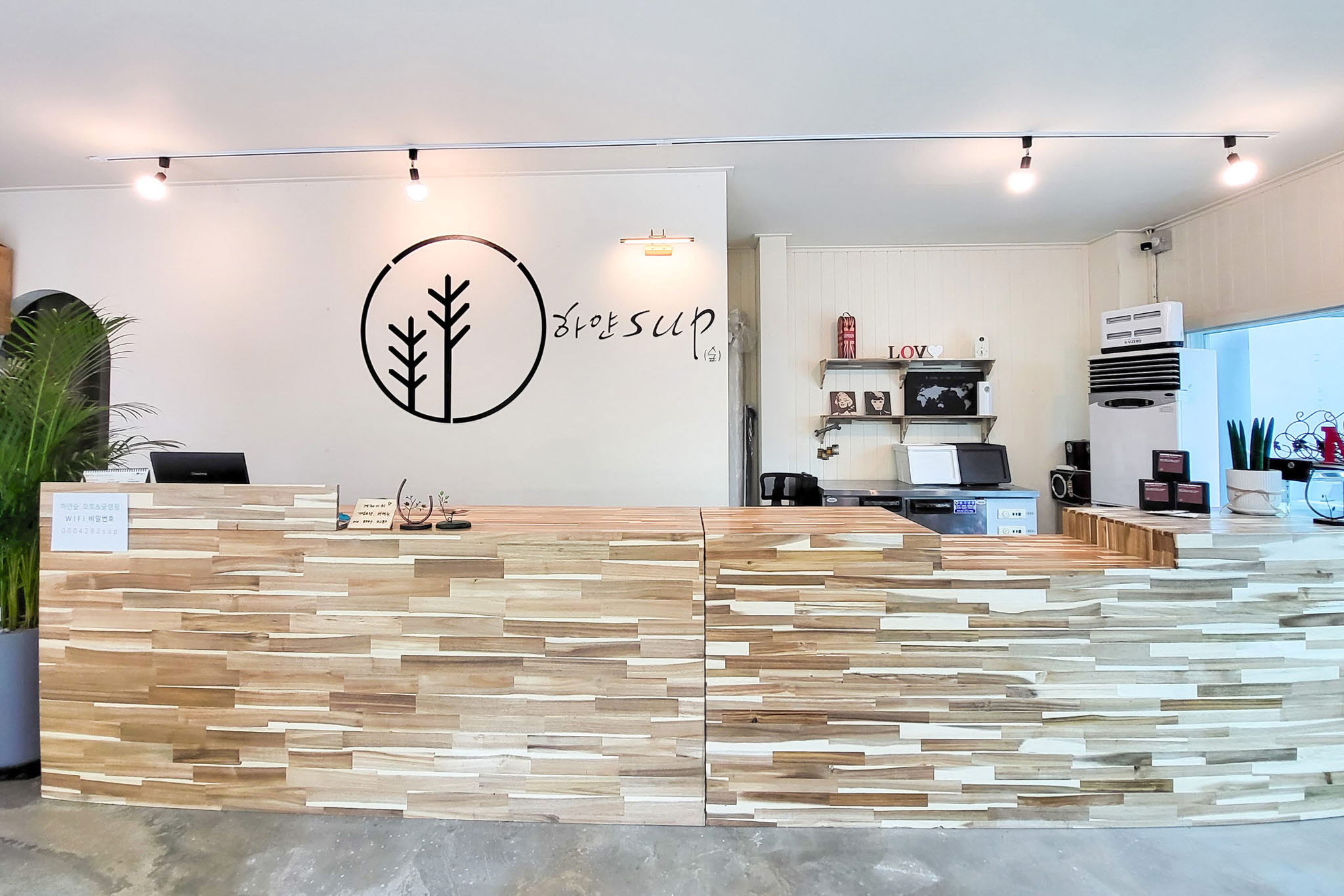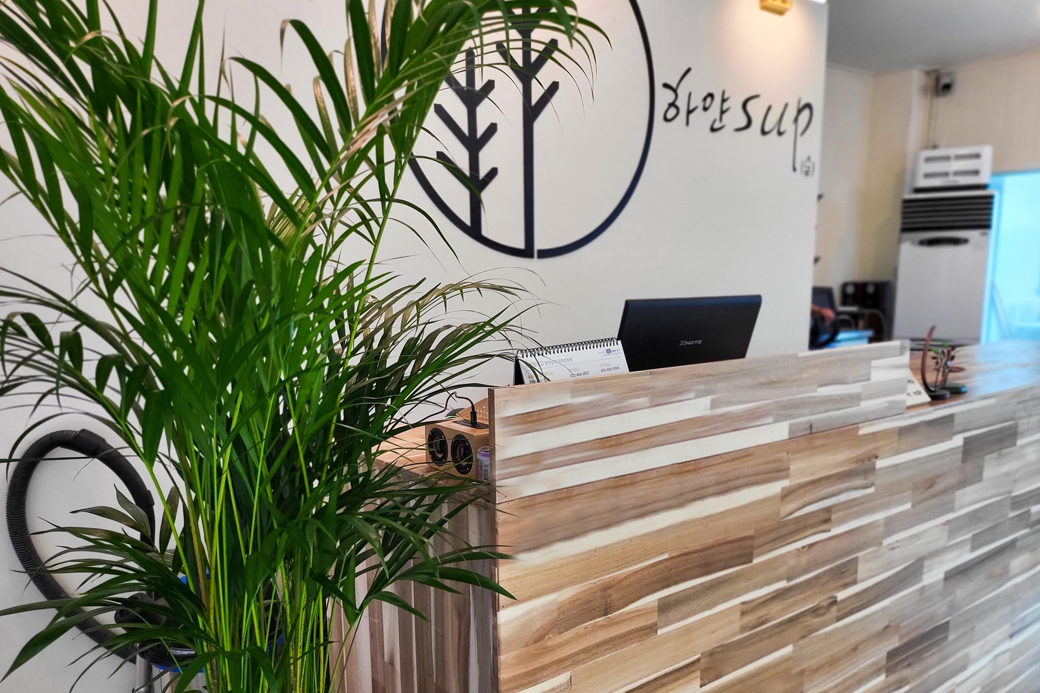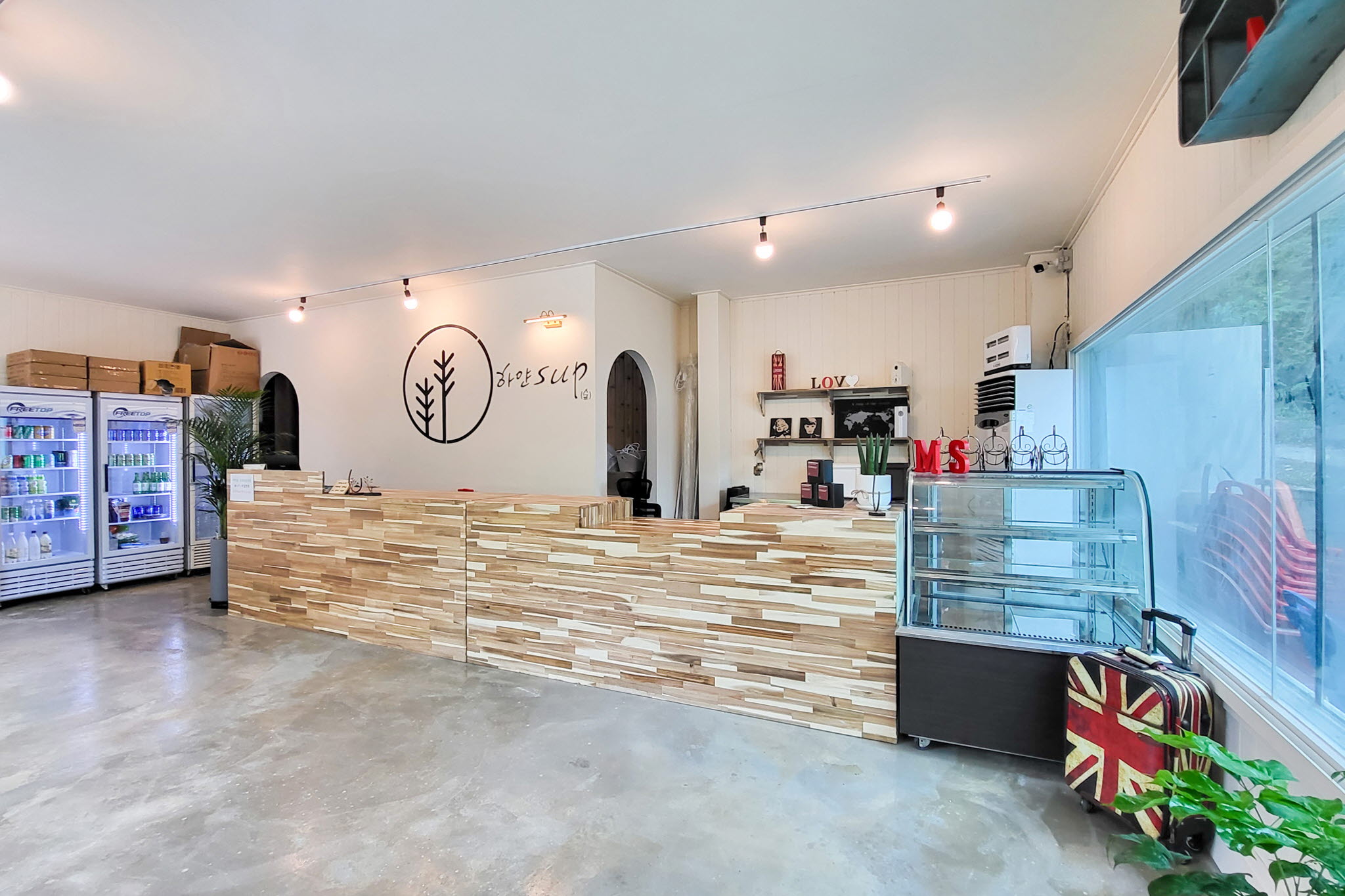하얀숲 오토앤글램핑 숙박 체크인 및 문의사항 안내 데스크, 간단한 매점 상품이 비치되어 있어요.